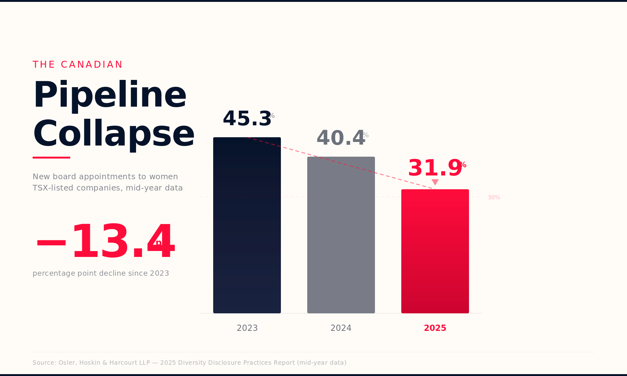 In Canada, representation looks stable only because turnover is slow - women reached 30.5% of TSX board seats in 2025. But the pipeline is collapsing: the share of new board seats going to women dropped from 45.3% in 2023 to just 31.9% in 2025.